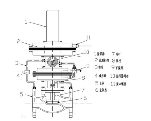 阀采用先导式结构,有两个薄膜执行机构(指挥器和主阀各一个)阀后压力 不直接控制主阀芯,而是指挥器执行机构控制阀门主阀的开和关阀前压力经过法兰通过5进入到减压阀4(主要起保持阀前压力稳定)在经过3进入指挥器阀芯10(指挥器阀芯是采用气关方式,阀后压力不在设定值时是开的状态)阀前介质通过指挥器阀芯10到达节流阀9,(主要起分流和平衡作用)进入主阀薄膜执行机构,(主阀薄膜执行机构采用气开设计)打开主阀芯7,阀后压力通过接管11同指挥器薄膜执行机构相连接,检测机构2接受到阀后压力和流量,带动指挥器执行机构向下关闭指挥器阀芯,阀后压力设定通过指挥器1内的调节弹簧恒定设定压力