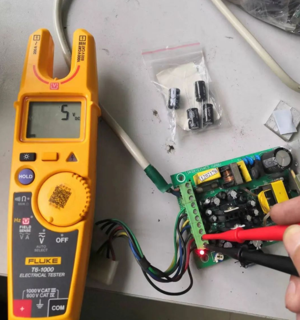8、更换同规格的电容后,通电,电源指示灯亮起,测量5V电压输出口为5V,24V输出口电压为22V,正常。